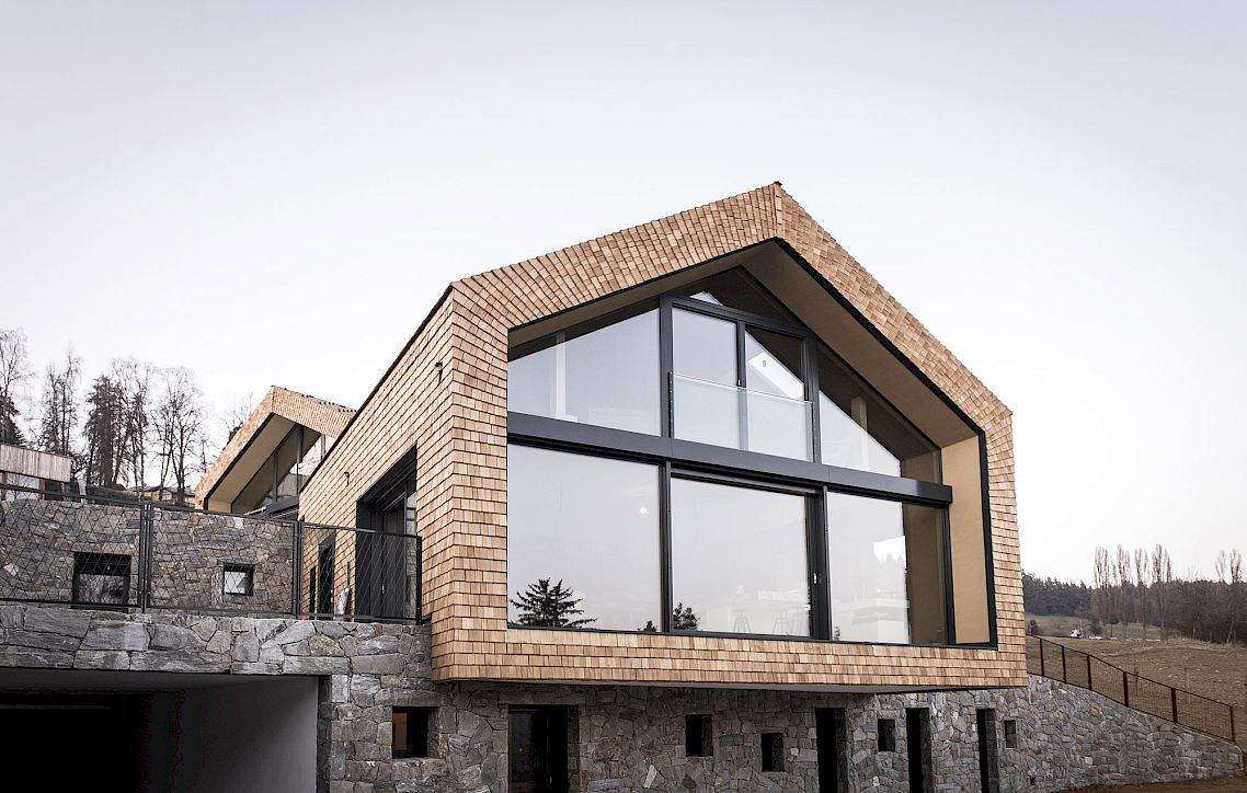 The aim was to implement the architecture into the surrounding in the most natural way; therefore, it was important to underline and reinforce local building traditions. The natural stone wall forms the basis of the architecture and softly melts into the landscape. Two simple houses with pitched roofs and covered all over with shingles sit on the stone wall and are looking towards the most impressive mountains scenery.