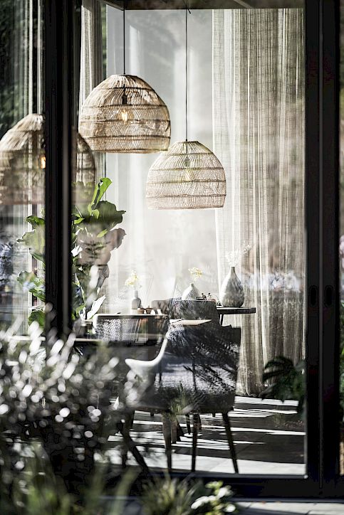 The suites on the ground floor blend into the topography. The entrance and adjacent bathroom are followed by a living and sleeping area which connects out onto the front terrace. Luxurious swinging hammocks with fluffy pillows, which are also seen in the wellness area, lend a relaxed, country flair. Nature and the characteristics of the region play an important role in the interior design. Wood cladding, milling, and coarse natural fibres are used throughout the entire inner decor - the materials run like a thread through all the rooms. The airy terraces are separated with an outdoor linen curtain.