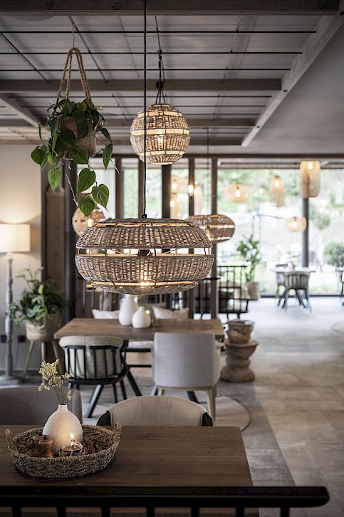 The open space is divided by loose old-styled cupboards and floor-to-ceiling permeable shelves. These shelves function as a transparent room divider, a presentation area for the hotel’s self-made products and as a library stocked with literature on culinary arts. These features create a cosy and inviting living room atmosphere. A natural spring water fountain allows for a refreshing drink. And as a unique highlight - there’s no classic buffet. Instead, guests are invited to tuck into treats displayed on an old planning bench, while in a séparée, a specially designed piece of furniture with fixed and mobile elements provides chilled and warm culinary delights, and can also be used for wine or food tastings. Even the tables and chairs in the light-flooded guest-rooms defy the usual stereotype, with a lively mixture of round and angular displays.