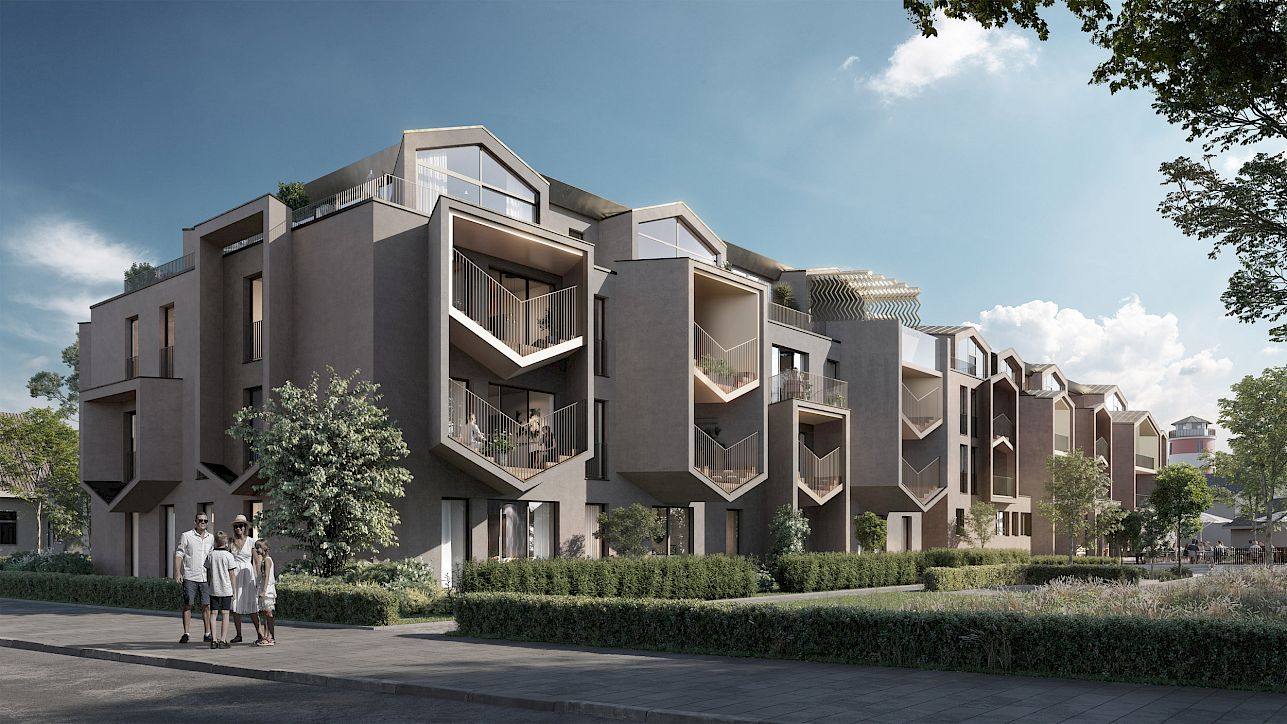 To break up the horizontal nature of the facade, overhanging frames have been created that extend across multiple levels and serve as loggias for the apartments. These are found in both the facade of the existing hotel and the new building, with sloped roofs that tilt either up or down. The modules are versatile in their design and utilize the triangular section of the loggias to allow for configurations with benches, tables, built-in planters, and stairs. Even in cross-section, the project moves away from linearity; NOA creates open spaces for canopies and outdoor areas with overhanging and recessed volumes. Inspired by the organic connection between humans, nature, and space, the garden and landscape architecture by the firm perspektive.grün harmoniously integrates into the overall architectural concept.
