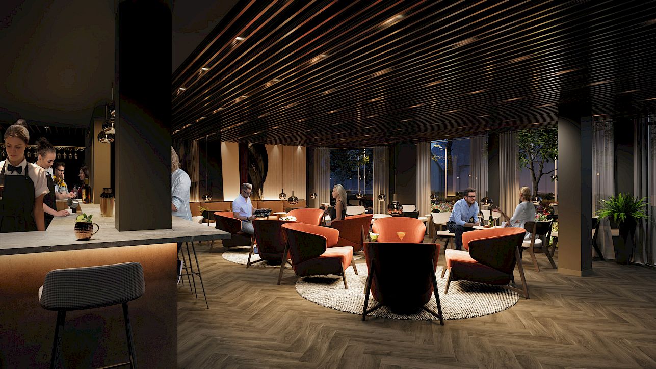 The size of the apartments ranges from one to three rooms, with areas of approximately 32 to 95 square meters. On the top floor of the new building, a penthouse will be constructed featuring two bedrooms, one of which includes a freestanding bathtub, a spacious living area, and an encompassing terrace. The apartments are divided into three interior design lines: Terra, Lago, and Bosco. These categories create a harmonious, calming interior and differ in the color accents of the wallpapers, parquet flooring, accessories, and tiles. Additionally, on the top floor of the new building, there will be a wellness area for residents, featuring a rooftop pool, panorama sauna, relaxation area, gym, and a yoga terrace. The infinity pool is framed by a golden metal lattice, providing impressive views of the lake landscape. Besides the apartments, the functional program also includes a restaurant, café, lounge bar, and a total of three terraces. These dining facilities are located on the ground floor of the existing building and are also open to external guests. On the second floor, there is a bridge between the two buildings that serves as a connection. Its walkable roof is used on the third and final floor, allowing direct access to the rooftop spa.