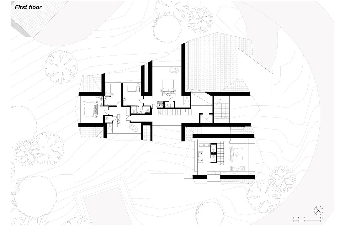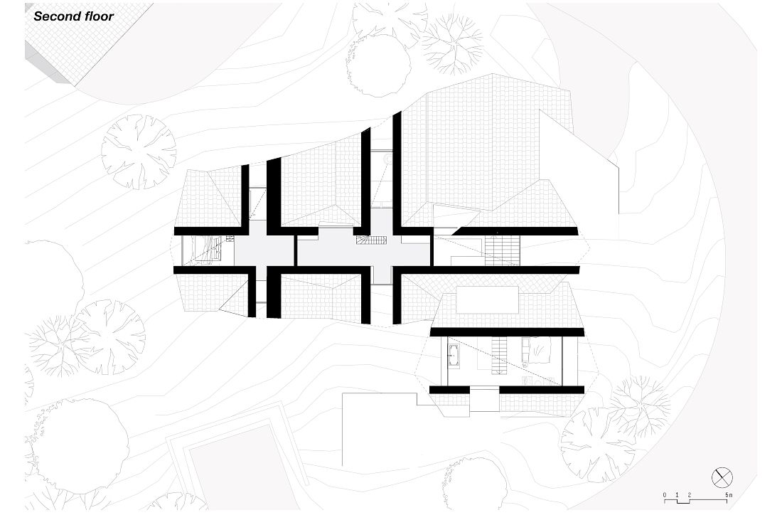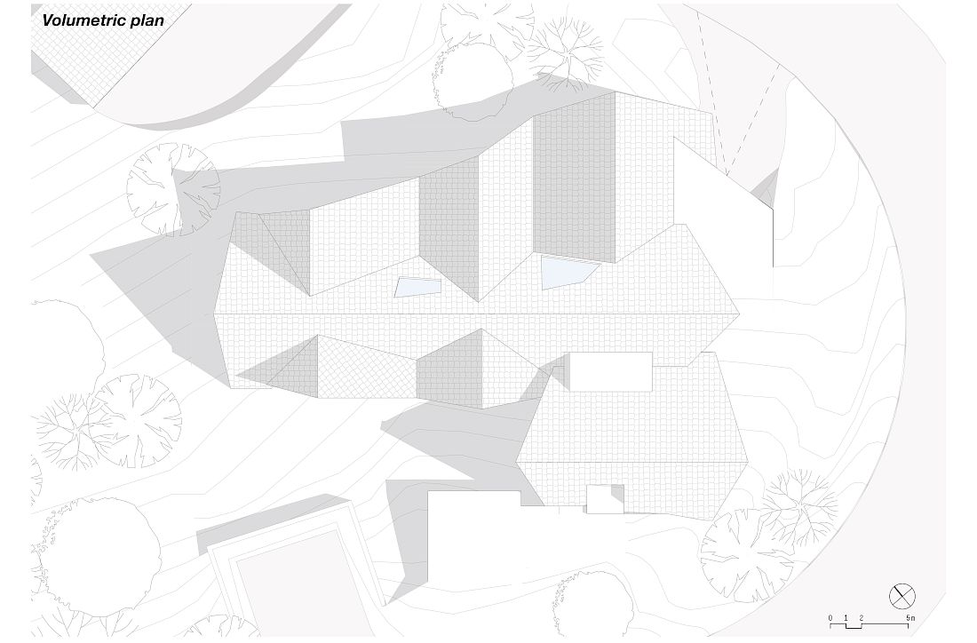 From the outset, the challenge of the functional programme turned out to be the coexistence of three different generations in what visually had to be a single volume. The interior layout of the spaces had to combine common areas with independent privacy zones for each of the families. In a perfect convergence between the client's needs and architecture, the team of designers decided to adopt the typology of the triangular house in a more complex interplay of volumes, creating a multifaceted spatiality with an increasing level of privacy on the higher floors.
