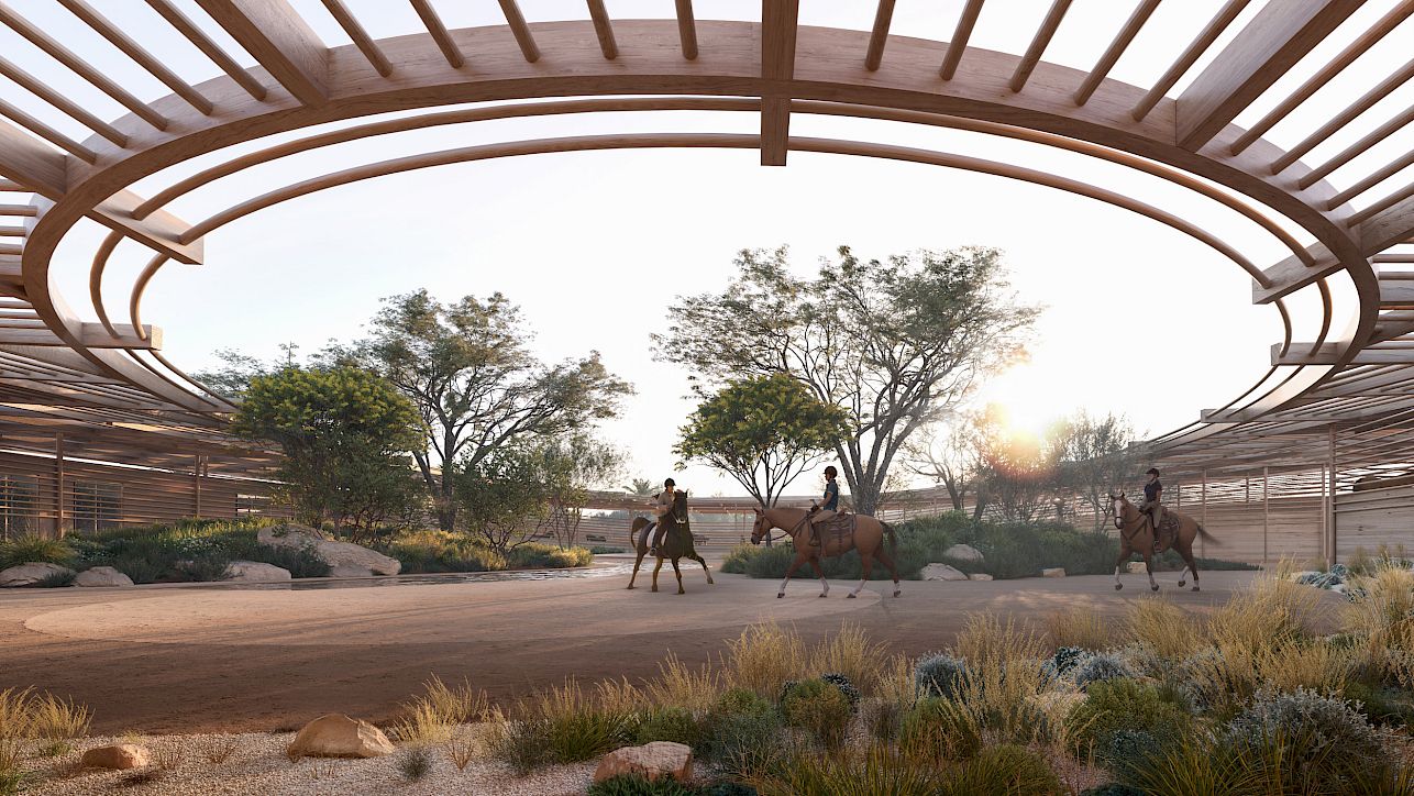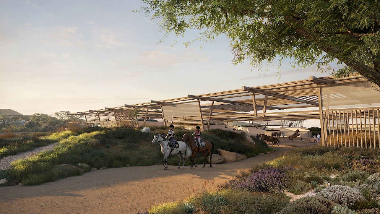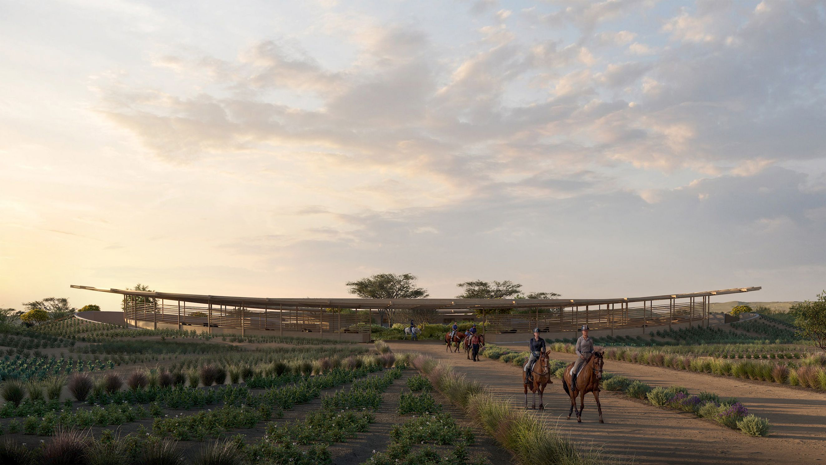 "The plot is enriched with lively native biodiversity, turning into a verdant agricultural garden. Boundaries separating guests from nature are dissolved: the fields become an integral part of the guest experience, guiding the visitor to the different five project assets: stables, competition arena, clubhouse, restaurant and farm residences."