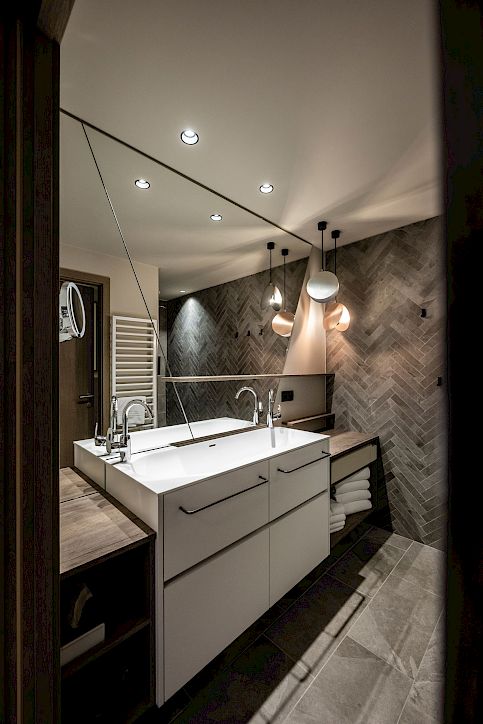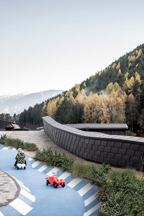 Throughout the entire complex, recreational spaces are interspersed with green areas that create continuity with the forests in the valley. “We literally brought nature up to the roof,” Andreas Profanter remarks. “The aim was to strengthen the link between the building and the landscape, without taking up any more land, but rather by creating added value and