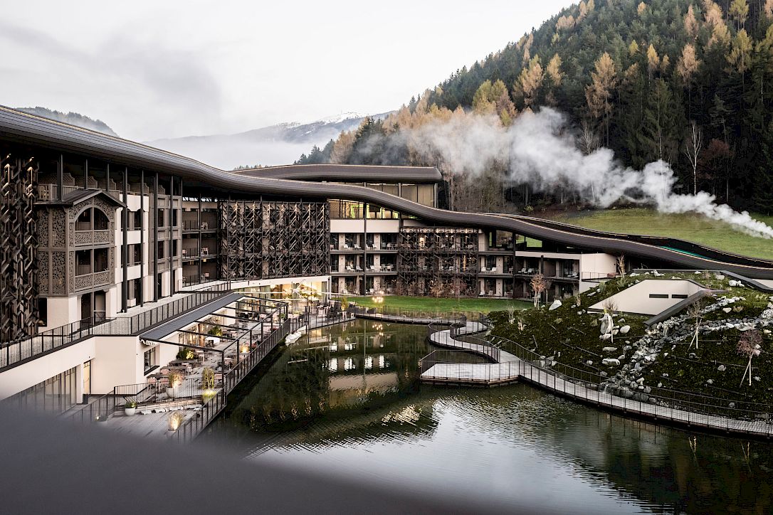 It is a historic hotel, the first to be opened by the Falkensteiner family, which today runs a group of more than 30 hospitality properties across 6 countries. Established in 1957 on the edge of the village on the shores of a small lake, the family resort has gradually expanded to cater for a clearly defined target group, that of families with children. The aim of the project was to add new spaces and functionalities that would reinforce this vocation, creating a kind of playground for the little guests and, at the same time, a place where parents could relax. A defining point of the project was also the beautiful Alpine surroundings, in which the hotel complex was meant to blend in harmoniously.