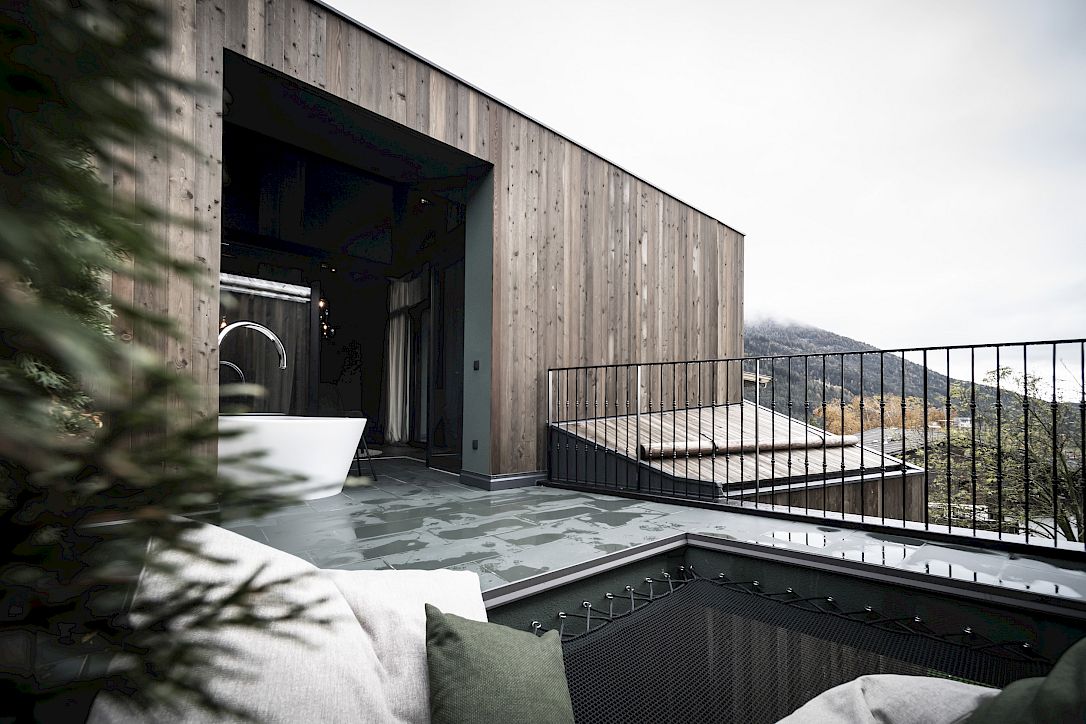 The most intimate area is located at the far end of the suite, where the entrance is: an open shower is elegantly flanked on one side by the self-contained toilet and bidet unit, and on the other by a small, private Finnish sauna, which guests can use whenever they wish. In addition to the many views and vistas, there is another highlight that makes a stay in the Green Suite irresistible: an open patio with an outdoor hot tub, which complements the sauna offer in an exceptionally appealing way.