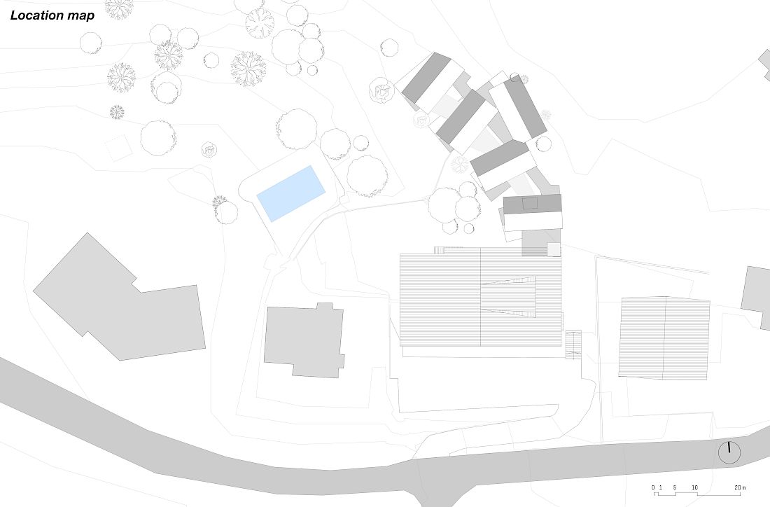 At the outset, the idea was to separate the building with the new suites from the original site in order to leave the grounds untouched and occupy as little space as possible. A building at ground level would have resulted in the loss of sizeable portion of the grounds. But the idea was not just a row of rooms door to door, but an orderly grouping of intimate, self-contained tree houses elevated on three-metre high supports, leaving the grounds fully accessible underneath.