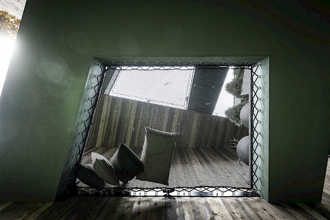 The interior decor is designed around a subdued green interspersed with shades of grey, adding to the tree-house ambience. Underpinning the overall concept are the fabric covers, tiles and painted surfaces, which help to merge inside and outside. The smoked oak flooring, fittings and bathroom units in a restrained shade of black blend harmoniously together.