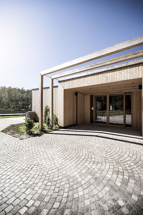 The floor and vertical surfaces add another unique feature to the lakeside facility: to plant the architecture firmly within its’ location, NOA incorporated a traditional South Tyrolean lace pattern into the resin filler. The motifs were briefly pressed into the damp resin and quickly removed to create an irregular, three-dimensional effect. These 3D patterns, sometimes more, and sometimes less readily apparent, add a special visual flair and a touch of spontaneity. While the main building exudes a characteristic presence and is roughly equal in size to the old structure, NOA created a concept in which the other volume takes a back seat optically. The wooden frame construction along the transverse axis, which connects the two facility buildings, also acts as a support structure for climbing plants. Within a few months, the planned fast-growing jasmine will envelop the changing rooms in natural, green foliage. When viewed from the lake, the greenery will make the building disappear into its’ surroundings.