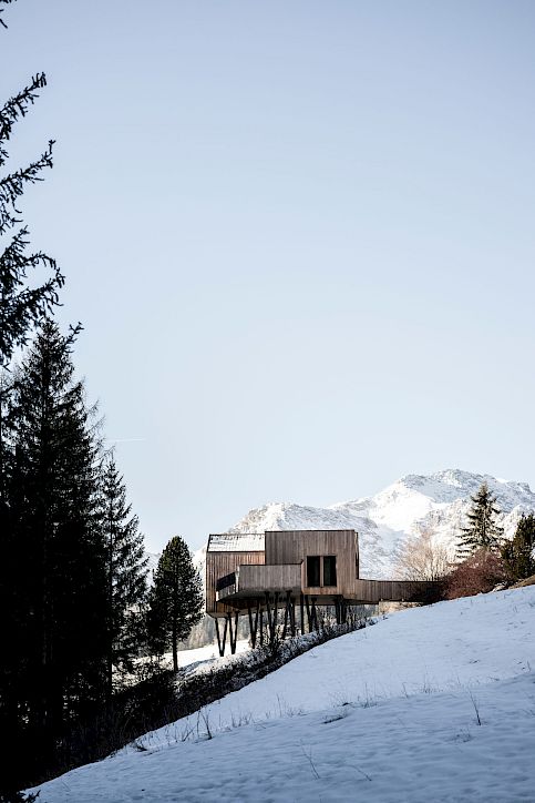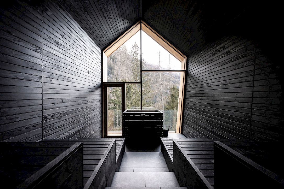 The new sauna is an elevated construction with eye-level views of the tree canopies. Made entirely of wood, externally clad in larch and internally in spruce treated with black wax, it blends into the forest and offers an impressive panorama of it both from the interior windows and a side terrace. It can be reached directly from the hotel via an aerial walkway, which leaves the meadow below free (where, by the way, the 'Marcialonga', the famous cross-country skiing event, passes by every year). Therefore, access to the sauna is only outside, even in winter: a choice that intends to promote, even in this case, strong and direct contact with nature.