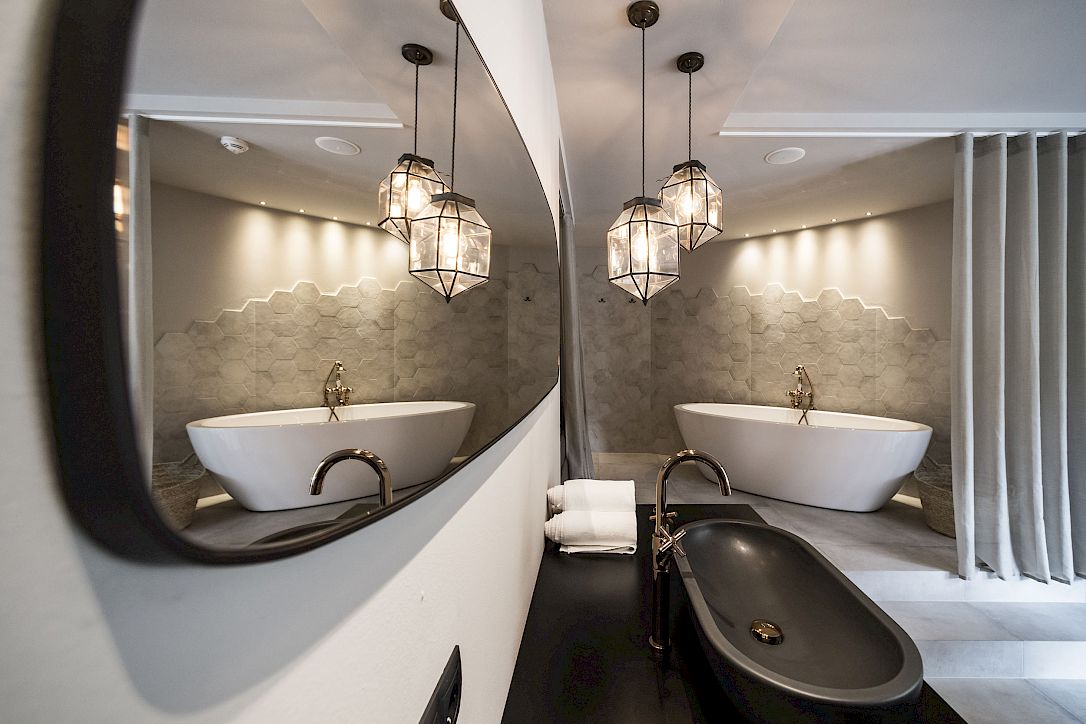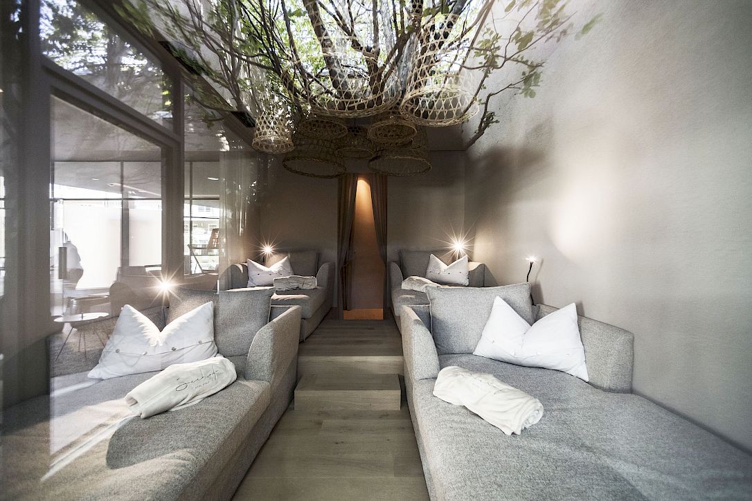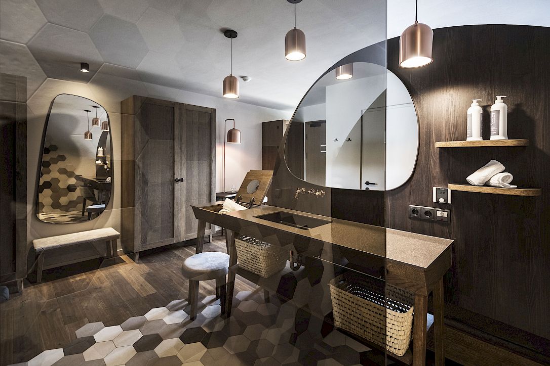 In 1958, Jakob Auer, grandfather of the landowner, founded the so-called soil improvement consortium on the Naz-Sciaves apple tree plateau, in order for the traditional cultivation of apple trees to be intensified. The widely used water pipes used at the time become an inspiration for the interior design. Copper pipes, which can be seen throughout the house, are consciously accentuated as a design element: in the bedrooms; the lamps, small tables, bathroom fittings and wardrobe hooks. In the spa-reception area pipes form an extraordinary view on the wall and ceiling.