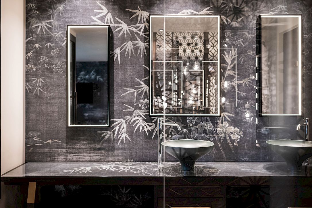 Particular emphasis has been placed on the moment of arrival: visitors are welcomed into an open space, and the eye is free to meander along the axis that stretches from the northern entrance toward the indoor garden to the south. This relaxing atmosphere invites guests to take a moment to rest and have a drink upon arrival. The stone fountain, newly designed fireplace area, and cosy seating alcoves damper the rigidity of a classic check-in. This intention is emphasized by the placement of the reception desk to the side. Echoes of Asia are subtle yet omnipresent and reveal themselves in the form of dark wood paired with shades of blue and grey, delicate pine bonsai trees in ceramic pottery, vertical boulders of local stone, and discrete lantern-shaped lights. An entire wall is dedicated to Tibetan prayer wheels: wooden cylinders that with the touch of a passer-by’s hand are set into a perpetual spin. Crisp lines create a harmonious atmosphere and give a resounding calmness and depth to everything. Like an annex to this scenery lies the classic Tyrolean stube — the very heart of the original Moarhof — its history, rustic style, and original wood are further highlighted by its direct proximity to the new bar area featuring minimalist tea ceremony platforms.