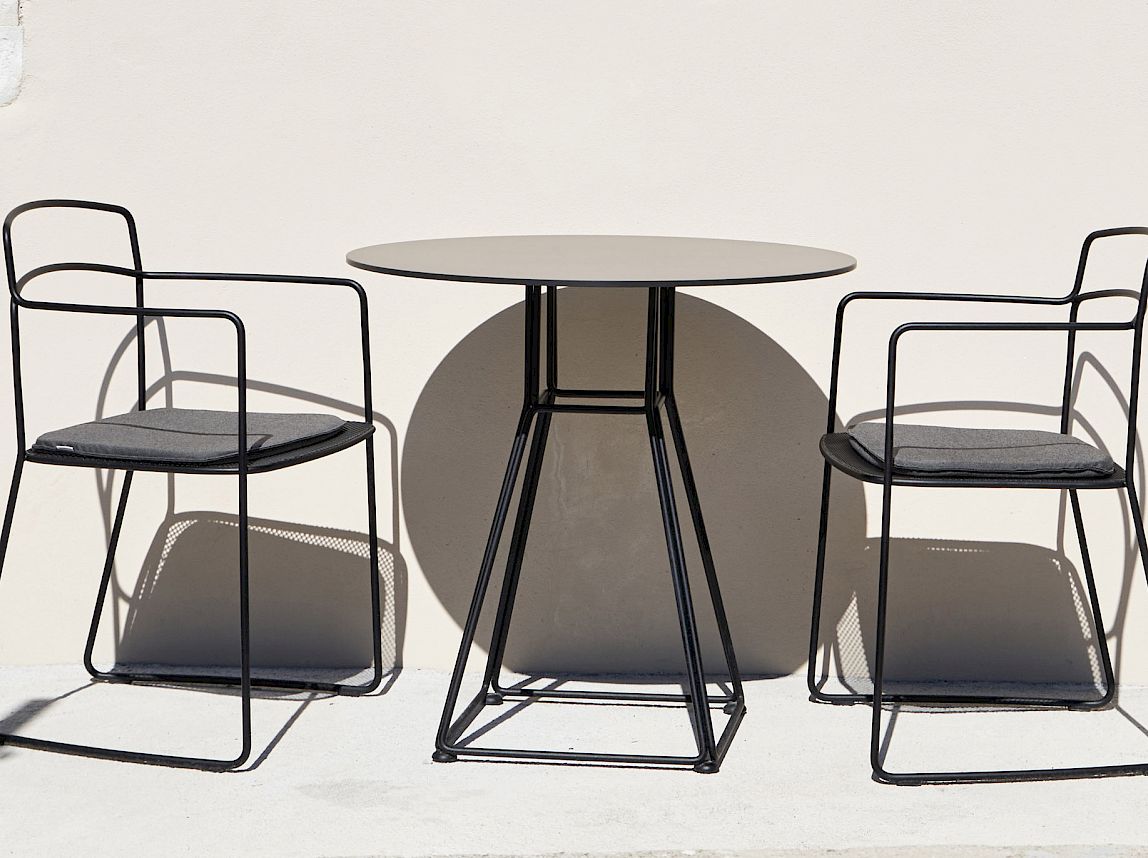 – Crafted from a sequence of metal wires to achieve an austere design, it is an outdoor table, with a rectangular or round top in metal or HPL. –